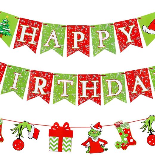 Christmas Birthday Party Supplies: 1pcs red&green Christmas Happy Birthday banner, 1pcs red&green grinch Christmas garland banner, unique design,pe…