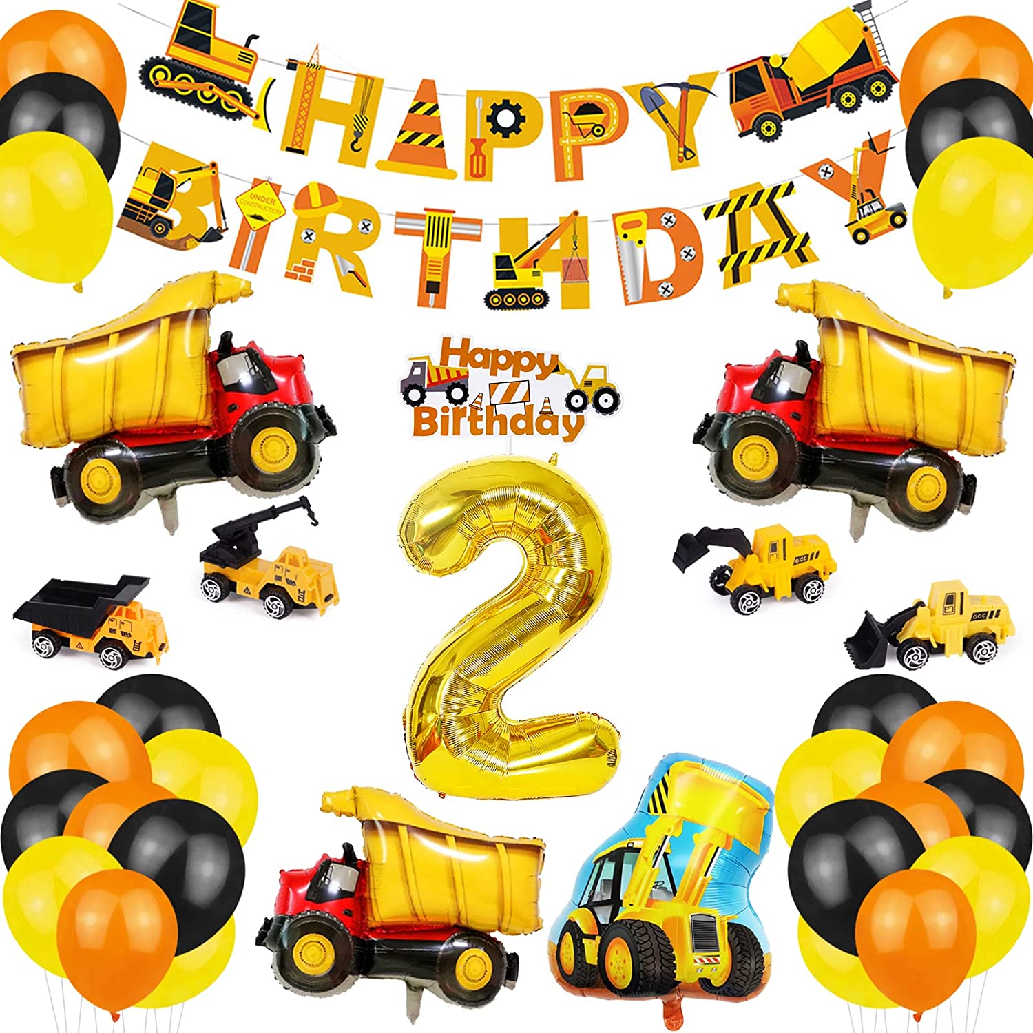 Refasy Birthday Decorations for Boys,Construction Party Supplies for 2nd Birthday Dump Truck and Digger Balloons,Birthday Banner,Cupcake Toppers for Kids Birthday Party