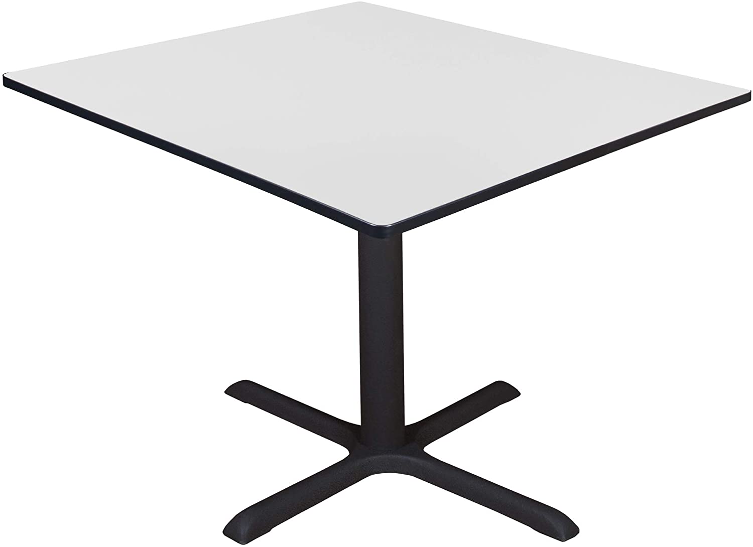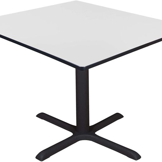Versatile Cain tables are at home in stylish cafe or coffee shop settings as well as lunch rooms and more Tabletop is constructed of a 1-inch thick thermal fused melamine laminate finished with a black T-Mold edge banding Rounded corners make the table safer for everyone Steel X-Base with hidden adjustable glides is protected with a black powder coated finish White laminate tabletop is scratch, stain and scald resistant and wipes clean easily