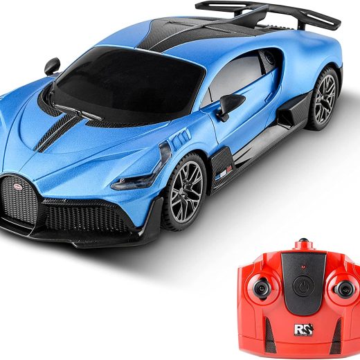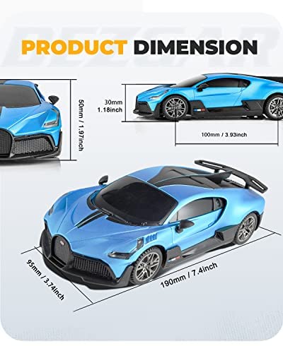 OFFICIALLY LICENSED BY BUGATTI1/24 scaled back on the real Bugatti Divo; model Bugatti Divo measures in 7.6 x 3.7 x 2.2 inch; great size for inside use.In addition, this Bugatti toy remote control car also has an eye-catching exterior design. The body uses blue and black color schemes. The headlights use the latest C-shaped light strip design. The bright headlights will move forward. Glow, bring more fun to your play.