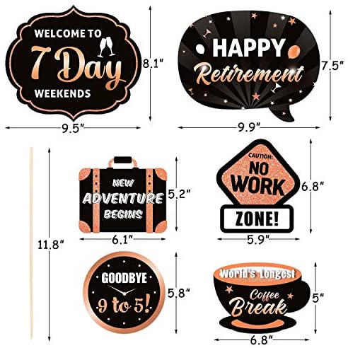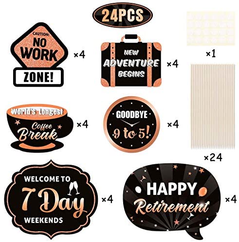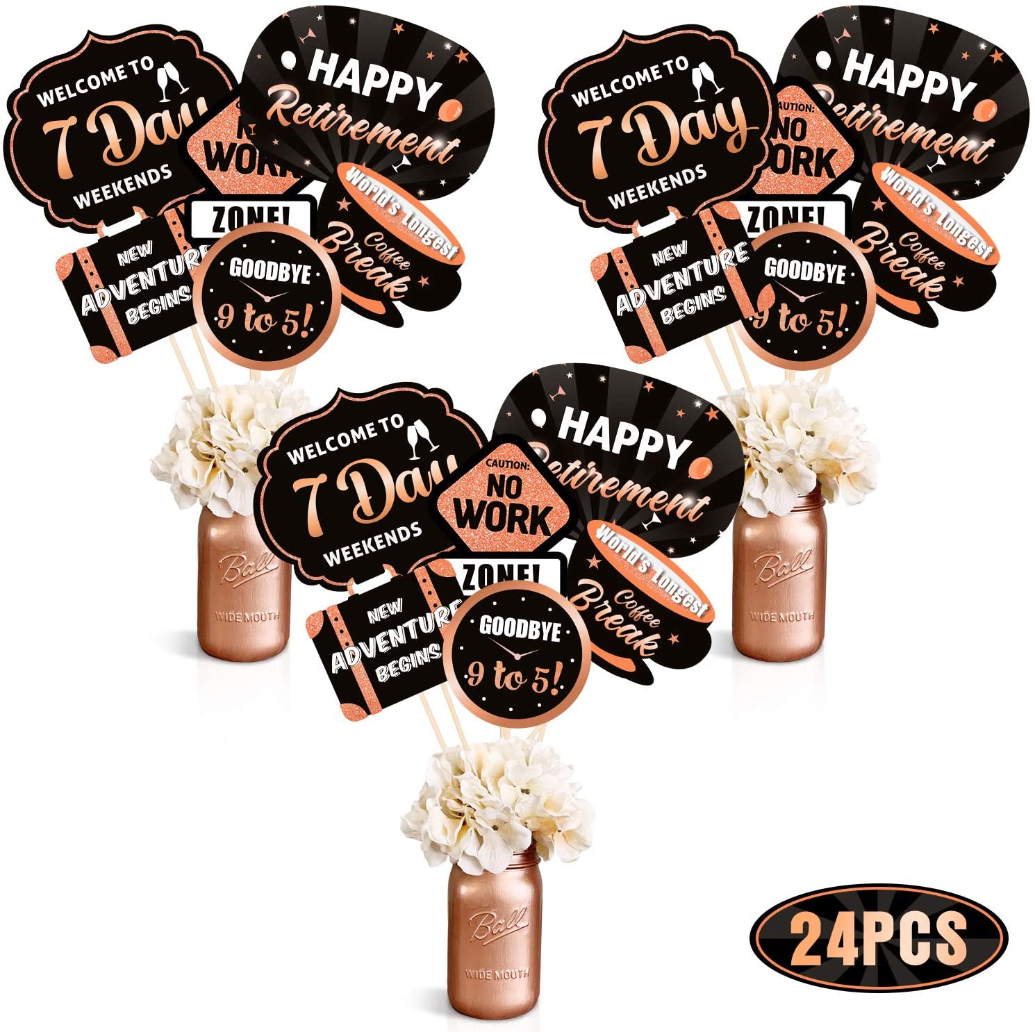 RETIREMENT TABLE DECORATIONS: Package includes 24 pack rose gold retirement table toppers in 6 different shapes with the wooden dowel sticks and glue dots. The perfect addition to your party celebration, these practical centerpieces sticks will be a big hit. GREAT ADDITION – These table toppers can be used as retirement themed party cutouts, table centerpieces, or photo props, and will add the perfect touch of sparkle to your event. Sure to give a deep impression to everyone. PERFECT SIZE & EASY TO DECOR: Each table topper piece is around 5.2’’-8.1’’ tall, and 5.8’’-9.9’’ wide, wooden sticks are 11.8 long. They can be easily set up into vases, jars or floral arrangements as a centerpiece on the party table. Also suitable for photo taking, which will make a lot of statements however you choose to use them! PREMIUM QUALITY & EYE-CATCHING DESIGNS: All the patterns are printed in advanced technology, which is sturdy, vibrant, and non-toxic. These rose gold table toppers centerpieces which will level up your amazing decorating ideas. QUALITY ASSURANCE: Fast logistics and 100% refund service, if you have any questions with our retirement party centerpieces, please feel free to contact us.