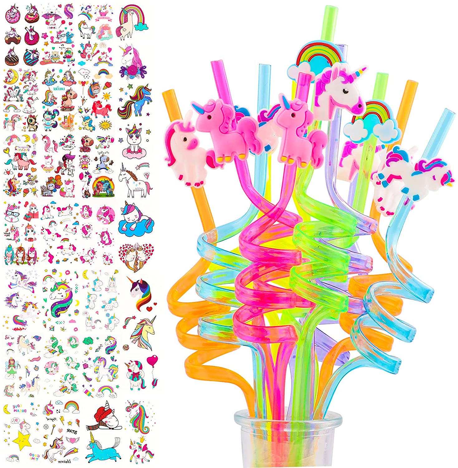 Reusable Unicorn Drinking Plastic Straws Unicorn Temporary Tattoos for Kids Girls Unicorn Birthday Party Favors Supplies