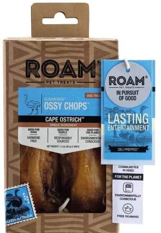 Roam Pet Treats Ossy Chops 2pk Dog Treats, Single Sourced Novel Proteins Long Lasting Chews Made from Ostrich for Dogs
