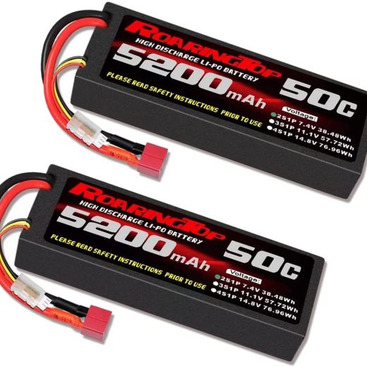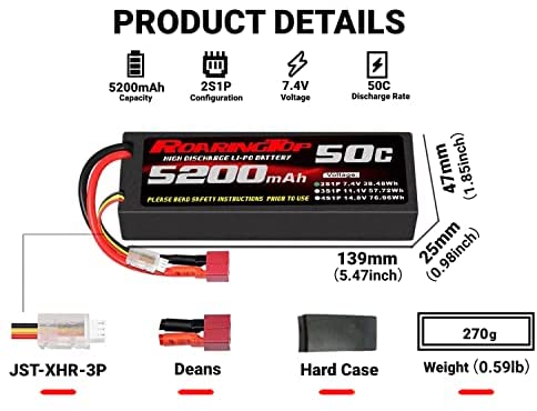 Roaring Top 2S Lipo Battery Advantage- Roaring Top RC lipo battery is designed with high capacity and powerful performace with a discharge rate 50C and 5200mAh, which will provide your RC models a long cycle life and longer runtime for enjoyment.