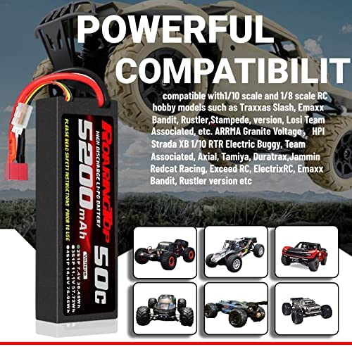 Application- Roaring Top 5200mAh RC battery compatible with 1/10 scale and 1/8 scale RC car hobby models such as Traxxas Slash, Emaxx, Bandit, Rustler,Stampede, version, Losi, Team Associated, etc. ARRMA Granite Voltage,HPI Strada XB 1/10 RTR Electric Buggy, Team Associated, Axial, Tamiya, Duratrax, Jammin, Redcat Racing, Exceed RC, ElectrixRC, Emaxx, Bandit, Rustler version(Only if the voltage, dimension and the plug match, then it will fit).