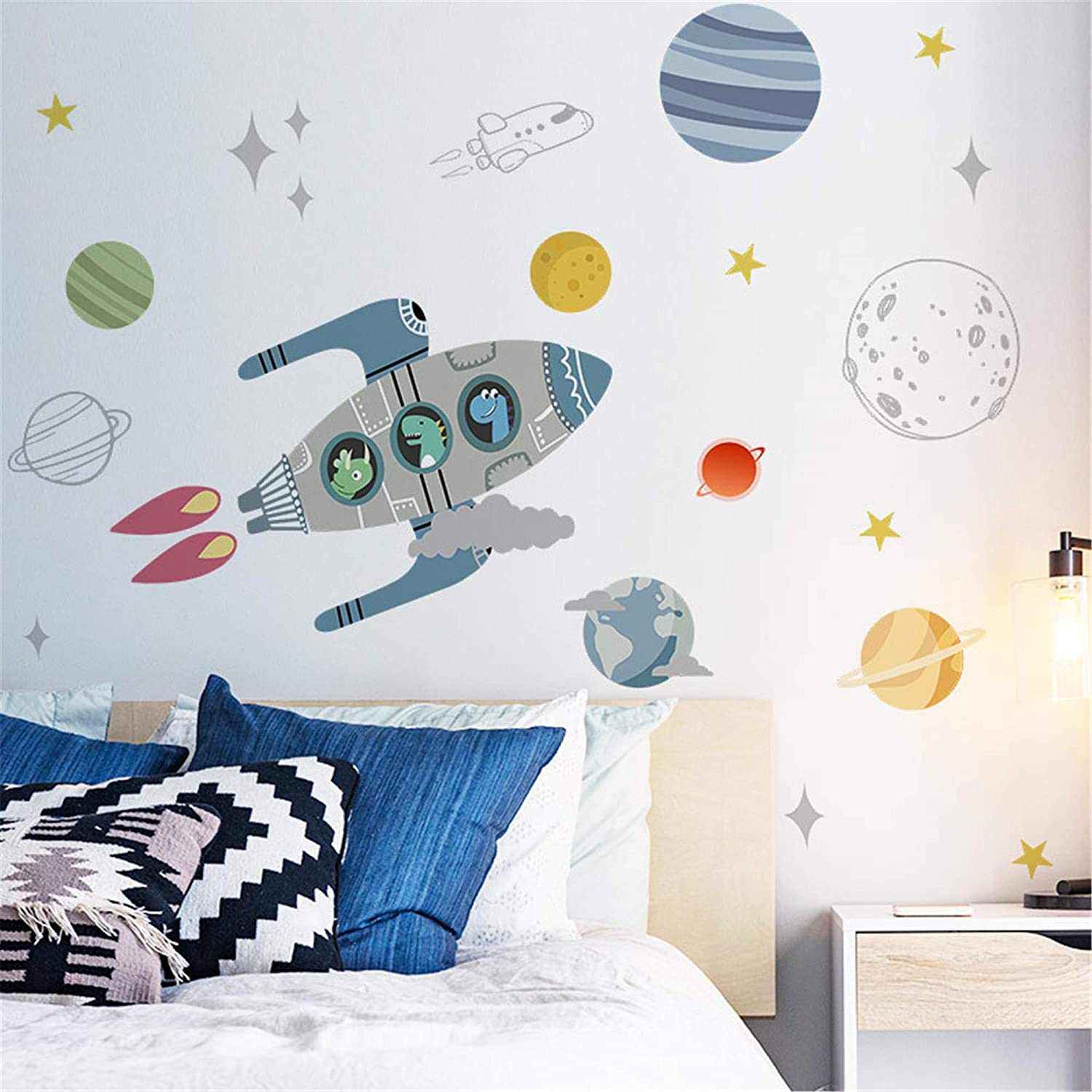 ROFARSO Cartoon Cute Dinosaurs on Rocket Wall Stickers Planets Outer Space Stars DIY Vinyl Removable Large Wall Decals Art Decorations Decor for Kids Boys Bedroom Living Room Playing Room Murals