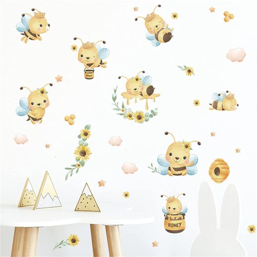 EXCELLENT MATERIAL:Our DIY bees wall sticker is made of premium PVC.This home decor is waterproof and removable. GREAT VALUE: This wall decal include 4 sheets of 11.4 x 15.7.The decoration is easy to paste and remove without harming the surface of the wall.If you use it in the correct way,this cartoon honeybee wall sticker can last for long times without peeling, wrinkling or fading.This sticker is very suitable for door,cabinet,nursery,bedroom,playroom,living room,childrens room,office,shop.It’s also a great gift for your kids,grandchildren,neighbor and friends. ENJOY IT: Come on!Add some color and fun to the life!Let’s make the room bright and lovely with these lovely bee,flower,cloud and star patterns.It’s also a good gift for your kids,friends and new neighbor.The finished size is not stationary,you can give full play to your creativity and inspiration to use these DIY stickers and enjoy it with your kids or friends. EASY TO USE: This premium decal is convenient to use.Just peel them off carefully and stick them on the smooth,clean,dry and dust-free surfaces with your hands.If there are some bubbles,you can use a scratch card to remove the bubbles or use a needle to pierce the small bubbles and smooth them, it will not affect the overall paste effect.If you find that the side of the sticker is slightly rolled up, use a hair dryer to slightly heat the adhesive and press it firmly. ATTENTION: Please check the size before buying.Make sure the wall surface is smooth,clean,dry and dust-free.When removing the wall sticker,you can use a hair dryer to heat the adhesive, and then use a knife to lift the corner of the sticker gently and peel it off slowly.Feel free to contact us if you have any questions.