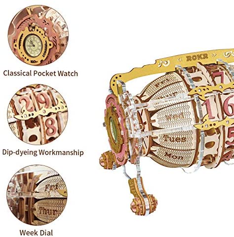 250pcs Brain TeaserThe wooden model kit contains 250pcs wood pieces and need your self-assemnly. Once assembled, it can be a vintage home decor. Assembled size: 84.6x57x57.5 inches Practical & DecorativeThe wooden calendar can be used for daily planning. Rotate the gears to change week, day or month. The pocket inserted on one side is a time indicator. Transparent acrylic frame and dip-dye color are super eye catchy. Sturdy to BuildHiqh quality wood and acrylic boards are sturdy for everyone even with clumsy hands. Laser cutting pieces fits well together. They are all connected by pins and tails. It comes with a clear English manual with step-by-step illustrations. Family ProjectPutting a mechanism together is challenging and absorbing. The building kit can improve kids eye-hand coordination and logical thinking. Youll have a fun time to build it with family and kids. Vintage Home DecorThe 3D wooden puzzle is a great solution for interior home decoration or gallery shelf accent. Stylish decor for home or office. Creative gift for all on occasion like birthday, Christmas, anniversary.