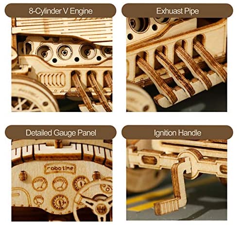 Scale Model VehicleIt is inspired by the evolution of road vehicles back to the 19 century.Characteristic vehicles of the era are replicated into the mini scale models with detailed structures. No Glue NeededUnique Mechanical 3D Puzzle,laser-cut ply wood,no tonxic,environmental friendly,smooth wooden board.All pieces are pre-cut,no glue needed.The interlocking mechanisms are pretty ingenious. Detailed English InstructionMaking this mechanical model toy requires not only attentiveness but also patience.Feel the pride of assembling this entire IQ toy set-up with your very own hands. Creative GiftWhat a fascinating thing to see the mechanical miracle coming to life by your own hands.Best Holiday gift for your boyfriend,girlfriend,husband,wife who is model builder or puzzle lover.It looks so cool and creates a decent challenge for an adult. Perfect DecorationThe 3D wooden puzzle has decorative designs that look captivating in the finished product.It is a challenge for both eyes and hands,and also a perfect display for stylish collections!