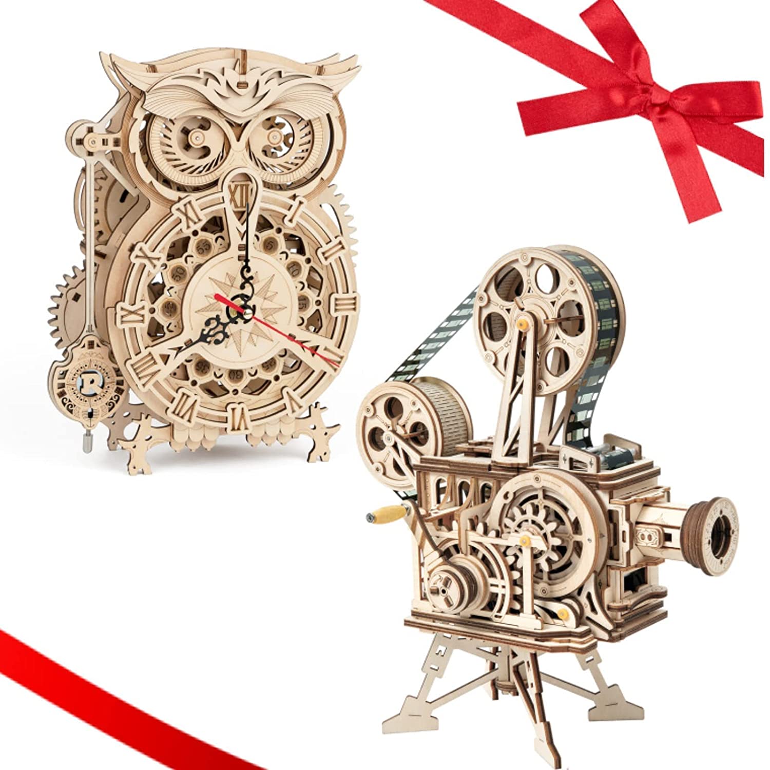 ROKR 3D Wooden Puzzles for Adults Owl Clock & Film Projector Bundle Gift Toys Home Decor