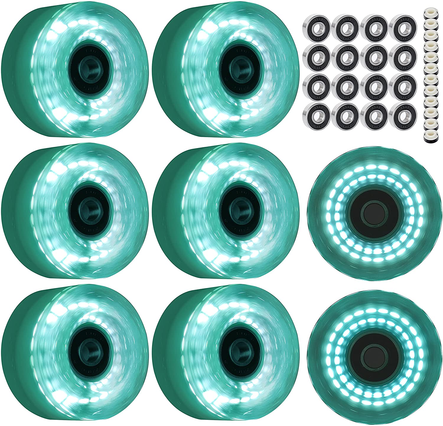 : FOMOTEAM Product: Light Up Roller Skate Wheels Size: Diameter 58mm(2.28inch), Width 32mm(1.26inch) Weight: 2.1 lbs(0.95kg)/ 8 wheels(with bearing…