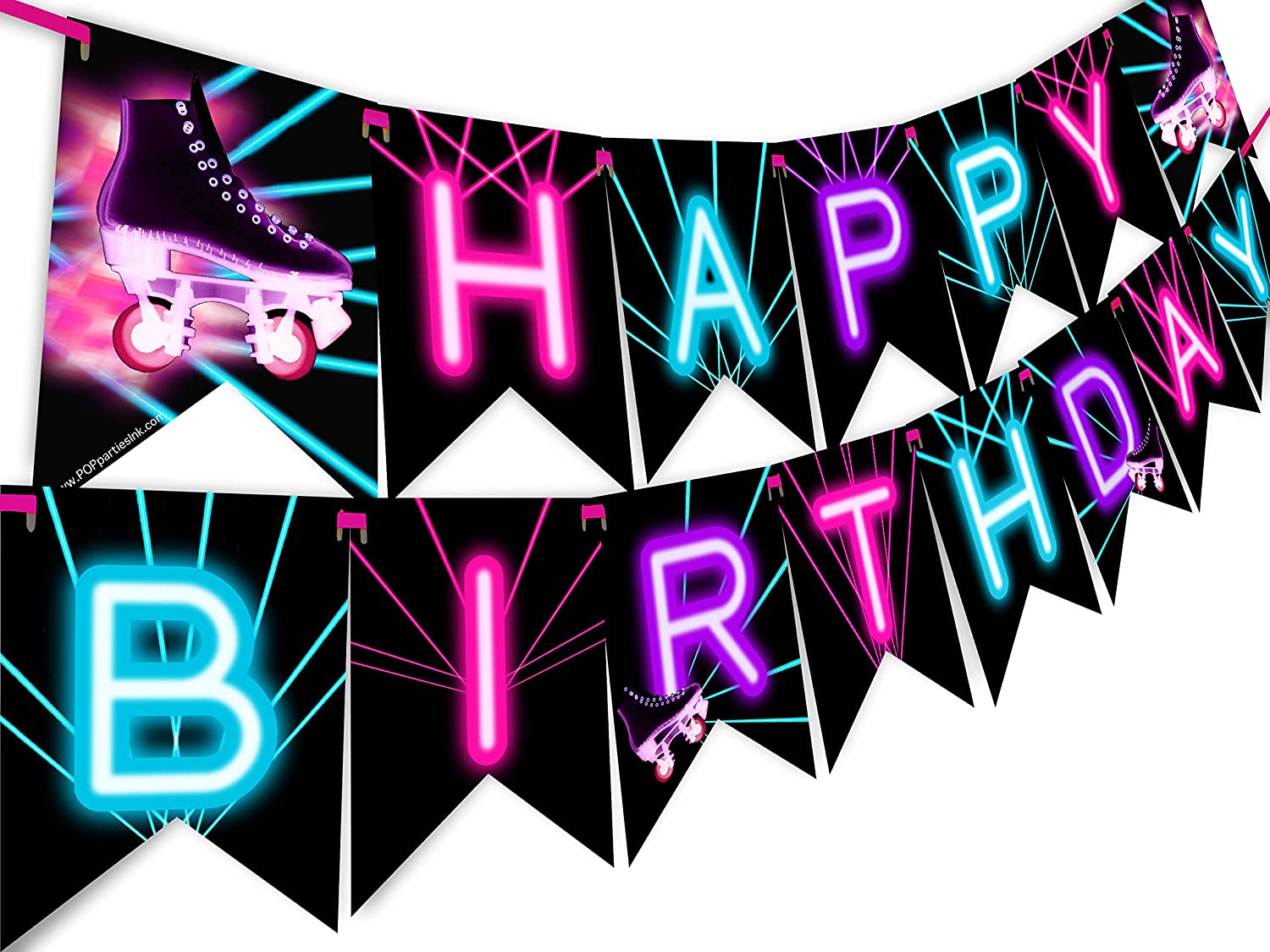 Roller Skating Glow Rainbow Happy Birthday Banner Pennant – Roller Skating Party Supplies – Roller Skating Party Decorations – Glow