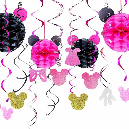 Decorate a Minnie Mouse themed party for your Disney fans children.You can decorate any applicable ceiling, such as party room, living room, childrens bedroom.And what you get includes:18 Foil spiral reflector sheet,Six pieces each in rose, pink and black,and 18 hooks and 18 lanyards are attached inside the package,hanging from the ceiling and attaching paper decorations to the bottom.10 PCS Minnie theme elements of the trinket,made with glitter premium paper cardstock.4 PCS Minnie Honeycomb Balls for 1st 2nd Birthday party decorations