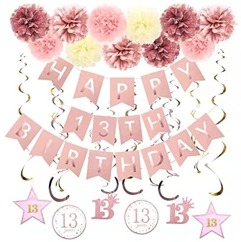 Rose Gold 13th Birthday Party Decorations , Rose gold Glittery Happy 13th Birthday Banner,Poms,Sparkling Hanging Swirls Kit for 13th Birthday Party Supplies