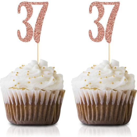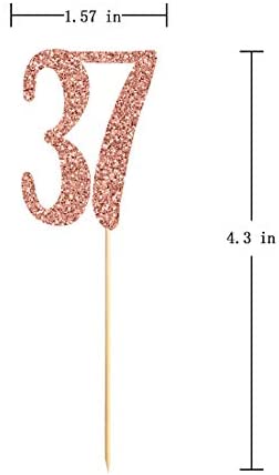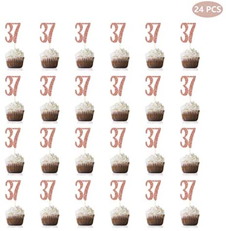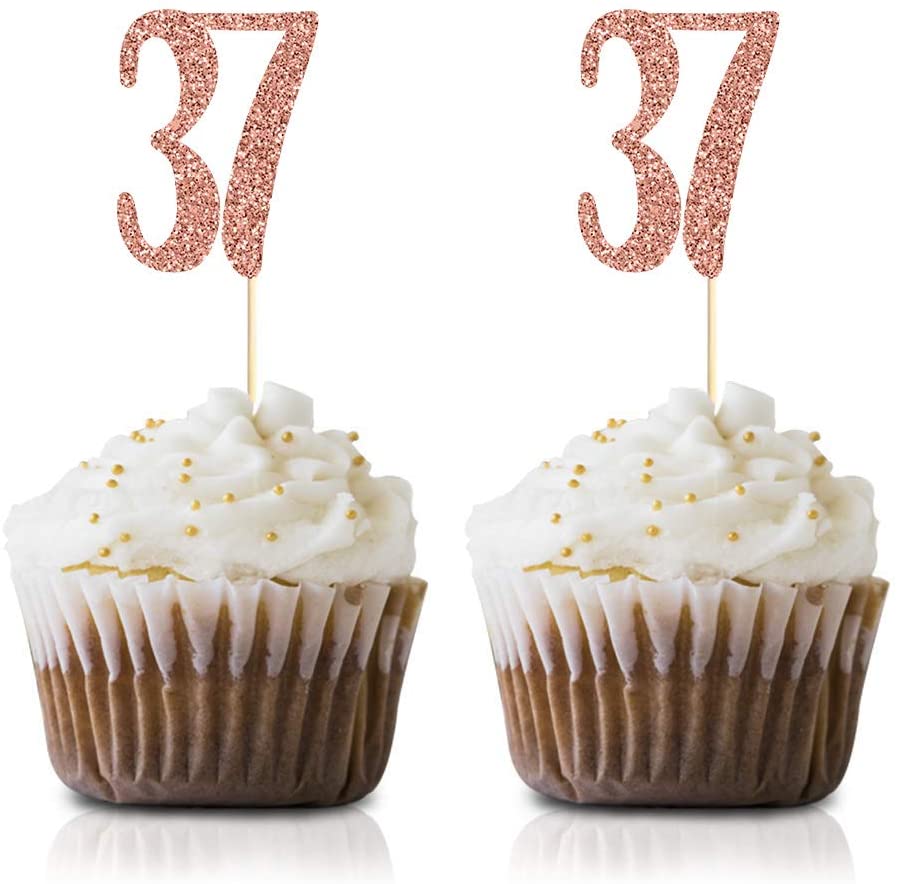 Rose Gold 37th Birthday Cupcake Topper, 24-Pack Number 37 Glitter Happy Birthday Party Cupcake Toppers, Decorations