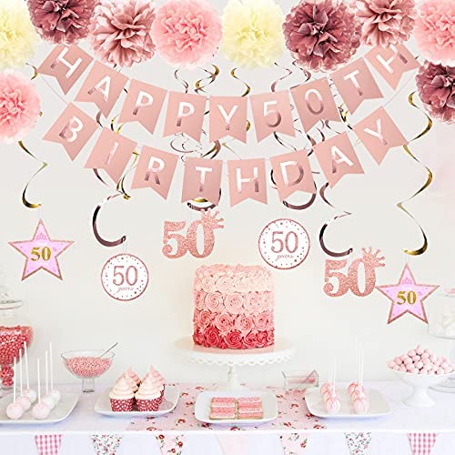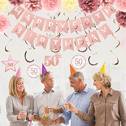 Rose Gold 50th Birthday Party Decorations , Rose gold Glittery Happy 50th Birthday Banner,Poms,Sparkling Hanging Swirls Kit for 50th Birthday Party Supplies