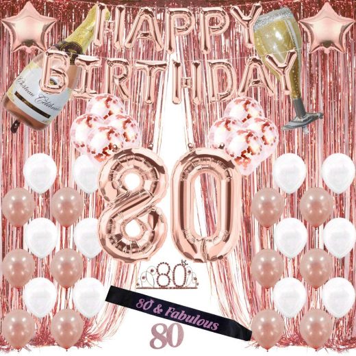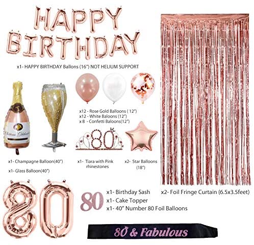 Rose Gold 80th Birthday Decorations for Women, 80 Birthday Party Supplies Include Foil Fringe Curtains, Happy Birthday Balloons,Birthday Tiara & sash, Cake Topper