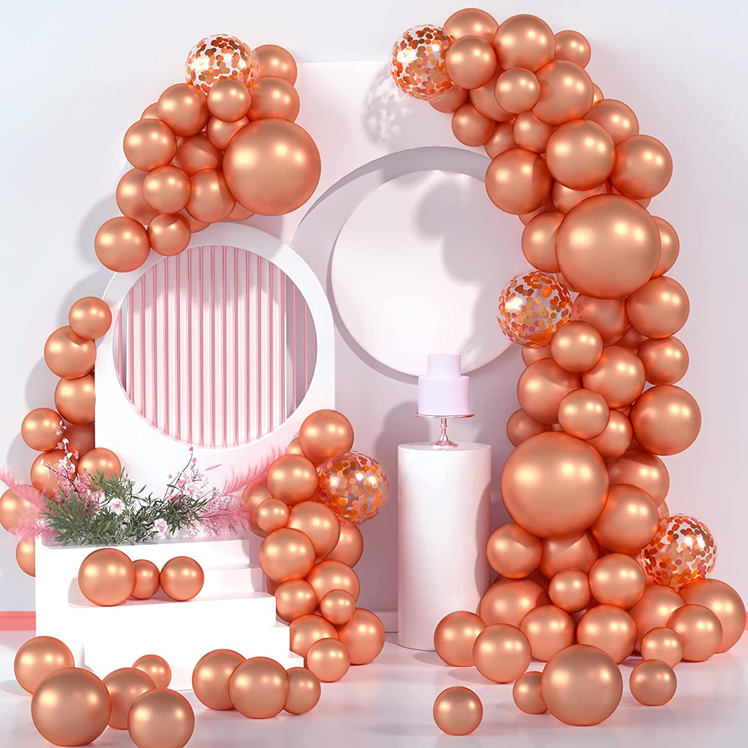Party BalloonsThis rose gold balloons kit includes: 83 metallic rose gold balloons, 5 rose gold confetti balloons, 100 glue dot, 1 double hole balloon strip, 2 golden balloon ribbons. You can freely match them with balloons of other colors, or directly make a rose gold balloon arch. Multi-size balloonsThis kit includes: 3pcs 18 inch large balloons, 30pcs 12 inch balloons, 25pcs 10 inch balloons, 30pcs 5 inch balloons. Quality balloonsOur balloons are made of latex, thick and pretty in color. They are very soft, can be easily inflated, and can hold air well for more than 48 hours. Easy to assembleThese balloons are easily inflated. And the double-hole balloon strip allows you to easily assemble the balloon into an arch. You can freely match other balloons and assemble them into any shape you like, which will be full of creativity and fun. Applicable to multi-scenariosThe rose gold balloon arch will made for an amazing display on your party. It is suitable for bridal shower decorations, baby shower decorations, christening, rose gold birthday decor, wedding decor, rose gold party decorations, etc.