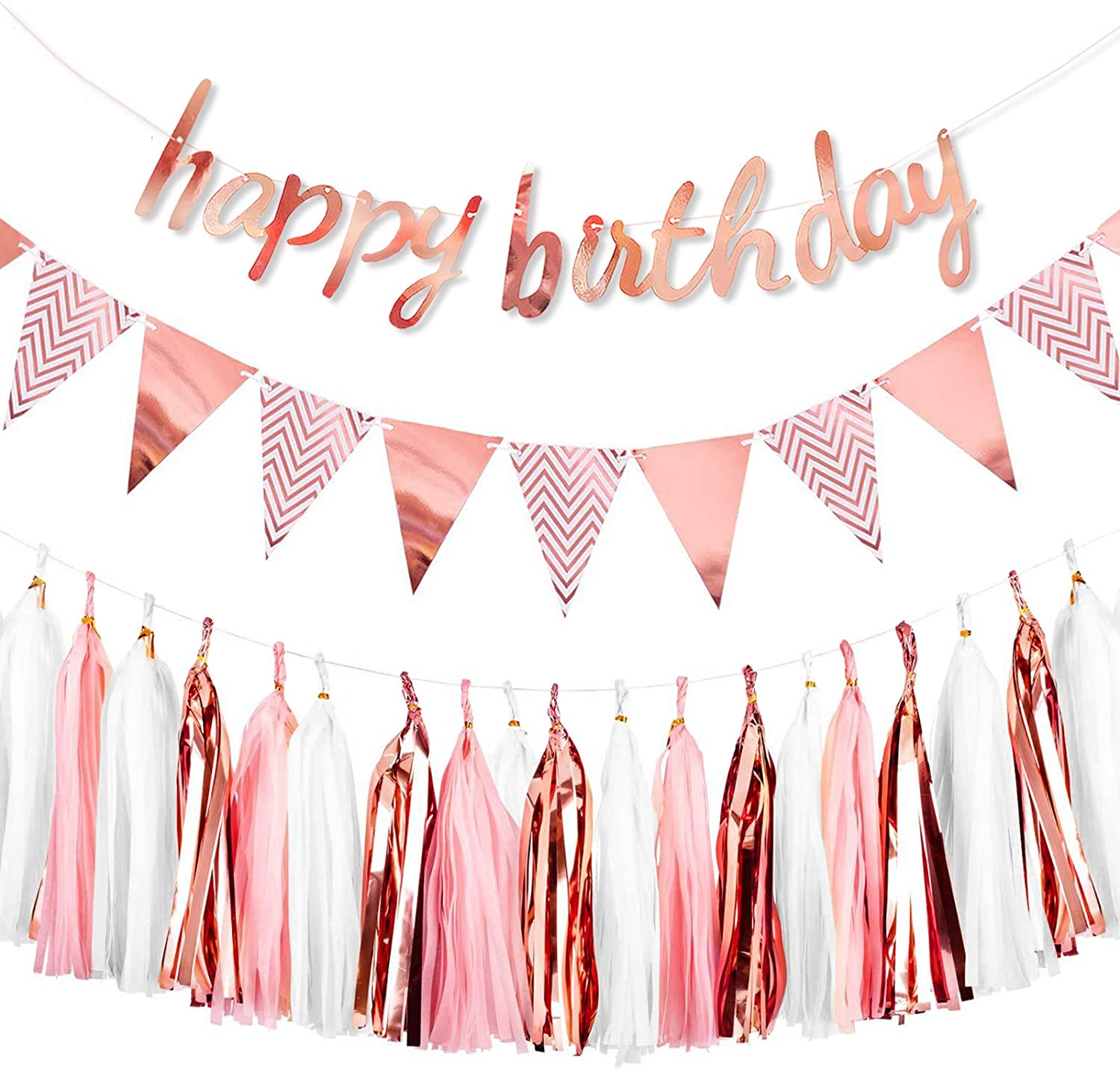 PACKAGE: Including pre-assembled glossy rose gold happy birthday banner + pennant flag banner + 15pcs pink white rose gold tassels, each color come…