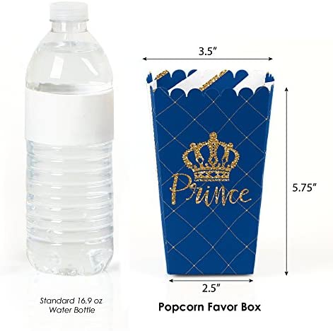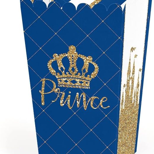 Royal Prince Charming Favor Popcorn Treat Boxes INCLUDES 12 little prince party favor boxes. Royal Prince Charming treat boxes are perfect for any event. The prince theme is great for a baby shower or birthday party. Royal Prince Charming party favor popcorn treat boxes SIZE 5.75 inches tall x 3.5 inches square at the top. The unique design and large size makes these 12-le petite prince popcorn boxes a must-have for any baby shower or birthday party. POPCORN BOX PARTY SUPPLIES: Royal Prince Charming popcorn boxes will hold a variety of party food. Fill them with sweet treats or salty snacks. Popcorn, caramel corn, candies and other goodies will look amazing on your candy buffet with these prince favor boxes. PREMIUM PARTY FAVOR BOXES: Royal Prince Charming party treat boxes are professionally printed on heavy-duty cardstock paper with a photo-like shine. They are hand-folded and individually inspected, then carefully packaged. Popcorn boxes will arrive flat. Easy assembly is required. MADE IN AMERICA: Royal Prince Charming – Baby Shower or Birthday Party Favor Popcorn Treat Boxes are designed and manufactured at our Wisconsin facility using materials that are Made in America. Our Treat Boxes use a No-Mess Glitter Print: Our popcorn boxes are designed with a printed image of glitter, eliminating glitter flake while maximizing bling effect!