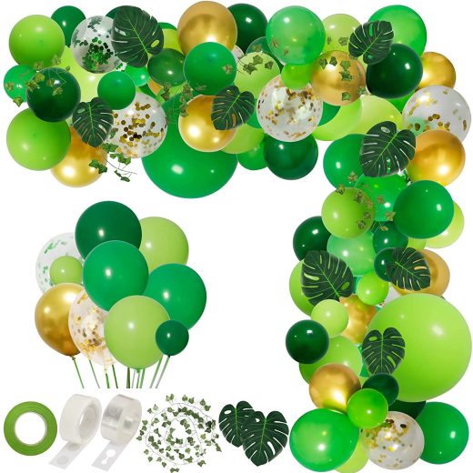 Jungle Safari Party Balloons:30pcs 5-inch balloons (dark green 10, green 10, light green 10), 80pcs 10-inch balloons (metal gold 20, dark green 20, green 20, light green 20), 25pcs 12-inch balloons (gold confetti 10, green confetti 5, dark green 5, light green 5), 2pcs 18-inch balloons (green 1, light green 1). Perfect Accessories: In addition to balloons, our green balloon arch garland kit also comes with dot glue, decorative strips, ribbon, 2pcs 30cm long-strip balloons, 16pcs artificial turtle leaves and 1pcs 2.1m artificial ivy garland. These rich accessories will create a memorable jungle theme party for you. High Quality: These balloons are made of natural latex, which is safe and non-toxic, can be used safely by children. The latex balloons can support air and helium. Wide Application: These green balloon garland is suitable for wild one birthday party, woodland baby shower, jungle safari theme party celebration and more. Note: Please do not inflate the balloon more than 85% to avoid sudden popping. Also take care to avoid high temperature, sharp objects and excessive friction.