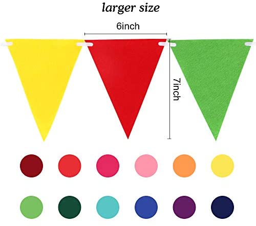 Felt Valuable Package The package comes with 5 pieces rainbow bunting banners, which includes 60 pieces pennant flags totally, 5 2.8m ropes and 5 threading pins. Both convenient and great value. Excellent Workmanship Use eco-friendly recyclable felt fabric (non-woven fabric), the pennant banner cutting is neat, will not easily fall off or break. Durable and reusable. Colorful Design Felt flag in rainbow tones. Each flag size is 6*7 inches and with bright colors that will light your mood and add beauty to your party. Wide Range of Uses Rainbow Party Garland is suitable for wedding, birthday, shower party, nursery, classroom and living rooms decoration. Note Felt pennants need to be connected in series by themselves. The operation is convenient and simple.