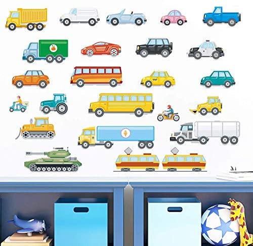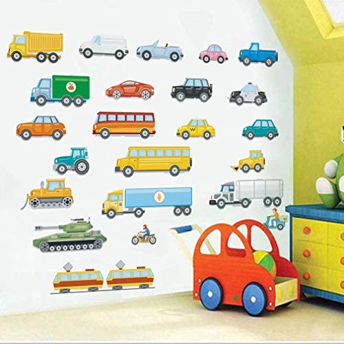 A fun way to decorate your kids room, elements included 23 different tranports, such as construction cars, trucks, sports car, motorcycle, taxi, electric car, tram, tank, police car, etc. Great for decorating boys room. Material: Vinyl.Non-toxic, environmental protection, waterproof. Easy to apply, remove and reuse without leaving damage or residue. Very easy to assemble and great focal point in your bedroom, childrens room, playroom, baby girls and boys room. It can be stuck to walls, furniture, tiles, mirrors and windows, any flat surface. Do not stick to any powder coated wall, irregular surface, oil and dust surface. DIY facilitate easier, richer color pattern. Just peel and stick and give your house wall a change.
