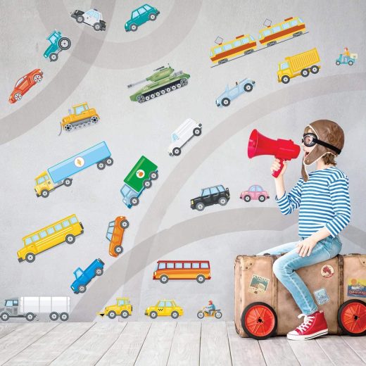 A fun way to decorate your kids room, elements included 23 different tranports, such as construction cars, trucks, sports car, motorcycle, taxi, el…