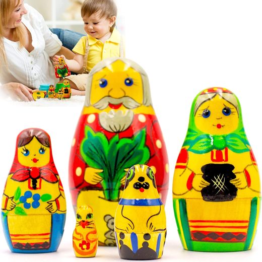 EXCELLENT DESIGN: russian nesting dolls for kids with characters from folk tale Enormous turnip ONLY ECO-FRIENDLY MATERIALS: natural wood, hand painted water-based paints, finished with varnish UNIQUE GIFT FOR EVERYONE: russian doll is great home decoration and educational toy for kids PERFECT DIMENSIONS: largest doll is 3.5, smallest is 0.8. Set of matryoshka dolls includes 5 pcs AEVVV is proud of high-quality russian matrioskas, if you arent satisfied well refund the purchase