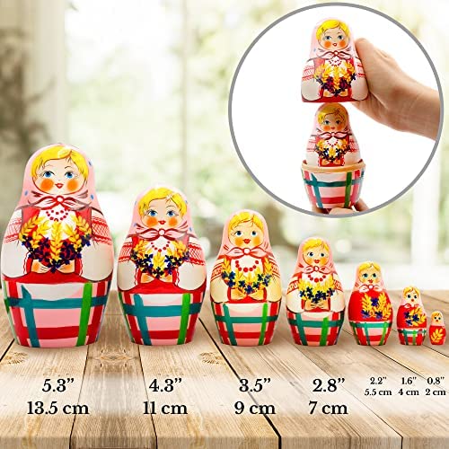 EXCELLENT DESIGN: beautiful belarussian girl in traditional folk costume with field flowers in hands ONLY ECO-FRIENDLY MATERIALS: natural wood, hand painted water-based paints, finished with varnish UNIQUE GIFT FOR EVERYONE: russian doll is the great home decoration and educational toy for kids PERFECT DIMENSIONS: largest doll is 5.3, smallest is 0.8. Set of matryoshka dolls includes 7 pcs AEVVV is proud of high-quality russian matrioskas, if you arent satisfied well refund the purchase