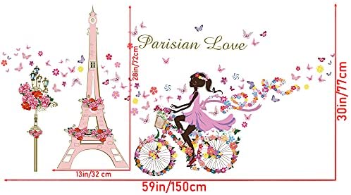 RW-9006 3D Flower Fairy Wall Decals Romance Paris Eiffel Tower Wall Stickers DIY Removable Girl Riding Bike Butterfly Floral Light Tower Decor for Girls Women Bedroom Living Room Nursery Decoration