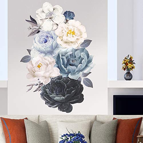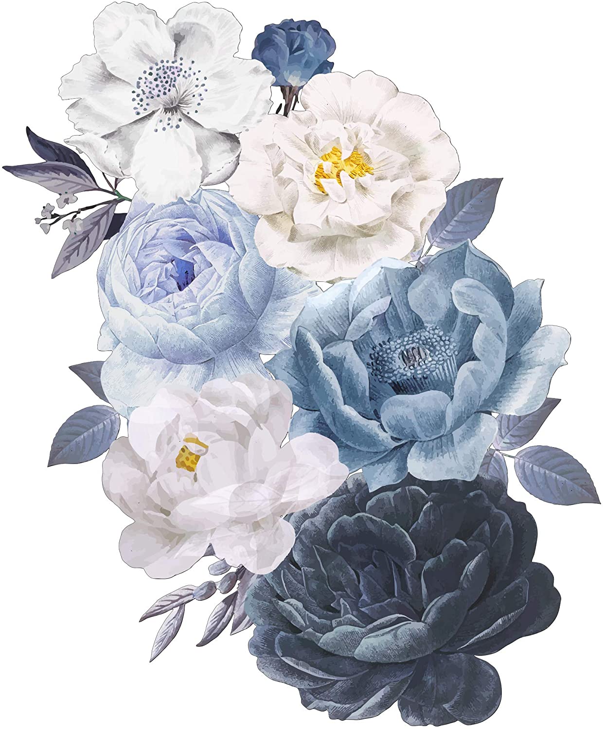 RW-D36 Peony Flower Wall Stickers White and Navy Blue Peony Rose Wall Decals 3D DIY Removable Peel and Stick Rose Wall Art Decor for Kids Baby Girls Bedroom Living Room Nursery Office Decoration