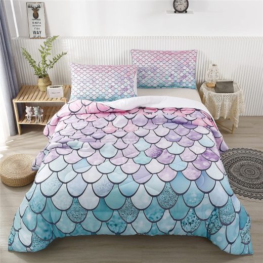 [Size & Measurement] Full/Queen Size Mermaid Scale Comforter Collections Totally Includes 3 Pieces: 1 Comforter: 90 x 90, 2 Envelope Pillowcase: 20 x 30 [Ultra Soft Fabric] The premium microfiber and the fluffy filling provides superior breathability and softness, keeps you warm and cozy for all seasons. [Romantic Mermaid Scale Design] This colorful mermaid scale print comforter set, excellent 3D printed highlights vivid colors, very cute and lovely, its an integration of art and vision. [Easy Care] 3D digital printing, not fading and pilling. Machine washed cold separately with gentle cycle. Air dry or tumble dry on low heat. Please do not bleach. [Good Choice as a Gift] This cute and lovely mermaid scale design comforter set, full of love and romance, suitable for all seasons. Good choice as a birthday gift or special holiday gift to kids, girls, teens, women and your good friends.