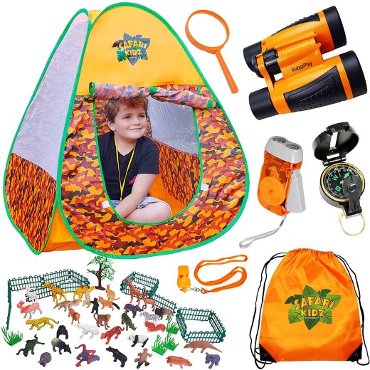 Safari Kidz Outdoor Adventure Tent Set, 53pc Animal kit, Pop up Tent, Binoculars, Flashlight, Compass, Backpack, Whistle, Magnifying Glass