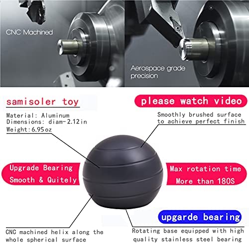Metal Please watch video Made of aluminum metal and machined by precision CNC. Desk toys has a helix groove milled the whole surface. Every ball has a rotating metal base equipped with high-quality steel bearing. Easy to play Designed to spin on desk floor or any flat surface. Simply rotate it by hand to creates an almost magical effect that looks like continuously flowing helix would merge into a surface of tabletop. It spins silently so you wont be bothering anyone around. Multiple applications When revolving it creates a full body optical illusion. It’s mainly suitable for creators, makers, thinkers, and anyone who wants to release their inner creativity and imagination. Keep focus, stress relief, eliminate anxiety, cure ADHD OCD or simply relax during working hours. Gift for anyone Hypnotic optical illusion is a unique way to bring excitement to anybody. And it is not only a dynamic desk toy, but also an exquisite desktop decoration. There is no doubt that it’s an ideal birthday or other present gifts for adults, teens, kids. samisoler Each unit is designed with attention to the smallest detail and built to last a long time.We aim to produce the best toy to satisfy all customers.