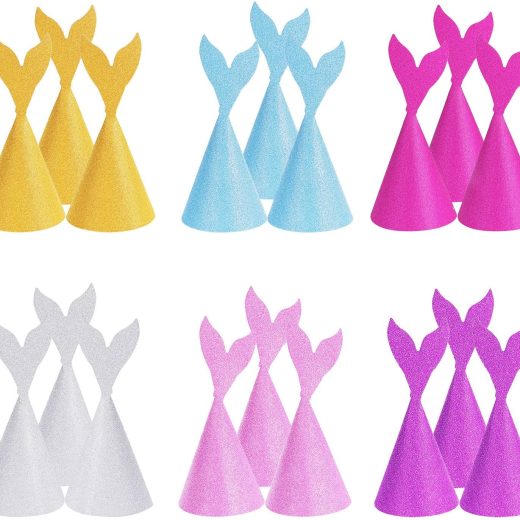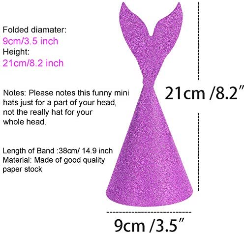 18 Pieces glitter mermaid tail party hats birthday crown for party decoration coming with ropes Application: The mermaid paper hats fit for birthday party scenes in school, in shop, at home, in the office or in party cosplay. Specification: Material: paper of good quality Color: silver, gold, blue, purple, pink, rose red Hats size: 10 x 21 cm/ 3.94 x 8.27 inch (width x height after folding) Rope length: 38 cm/ 14.96 inch Package includes: 18 x Mermaid tail party hat