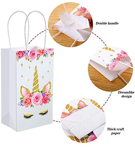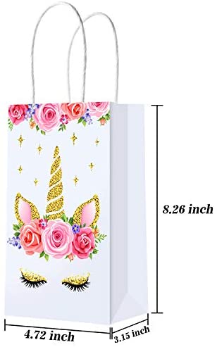 Package includes: 12 unicorn paper gift bags, with very cute and dreamlike unicorn designs; Size of every bag is 8.26 x 4.7 x 3.15 inches, proper size for your kids, match them with various candy, biscuits, party invitation cards, snacks, toys, etc. Quality material: unicorn theme paper bags are sturdy, durable and reusable with elegant unicorn printed; This unicorn goodie bag with handles are made of quality craft paper, no smell, light carrying Wide application: unicorn party treat bag has a wide application for girls and boys. It can be used as gift bags, goody bags, treat bags, candy bags for kids birthday party, baby shower, any unicorn theme parties, etc. Wonderful idea: every boy and girl have a dreamlike unicorn dream, the cute gold glitter unicorn design with rose can satisfy all the fantasy for unicorn; They will create the most celebratory atmosphere for you and your guests Note: glitter in unicorn paper treat bags is not physical glitter, its just an image that appears to look like glitter which is made by bright