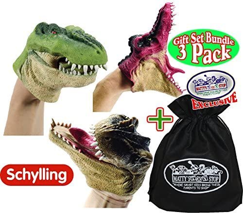 Schylling Dinosaur (T-Rex) Stretchy Hand Puppets Green, Brown & Red Complete Gift Set Bundle with Exclusive Mattys Toy Stop Storage Bag – 3 Pack