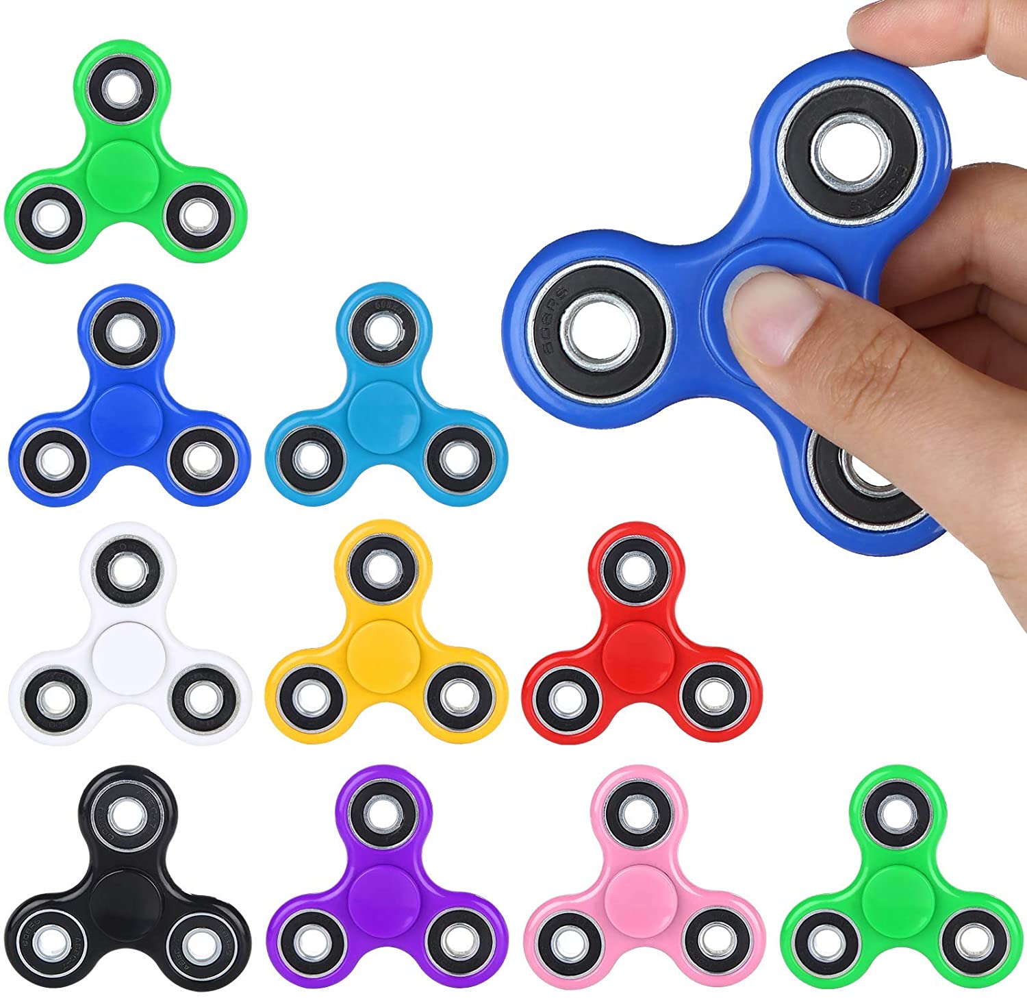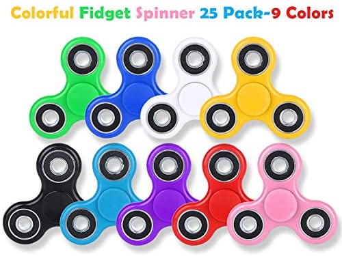 PACKAGE INCLUDED: 9 colors and 25 pack Fidget Spinners-2.95 inches*0.31 inches.Individual box packaged suitable for childrens gifts,bulk toys and prize for kids classroom ,also a good choice for party favors. HIGH SPEED HYBRID CERAMIC BALL in the center to ensure the smoothest rotation and consistency. 3 STEEL 608 COUNTERWEIGHT BEARING WEIGHTS to increase centripetal force and spinner time. BEARINGS ARE REMOVABLE for future upgrades. ROUND CORNER AND SMOOTH SURFACE: Protect your fingers from scratching. NO REPAIR, OIL, MAINTENANCE NEEDED: Use the stress relief toys right out of box. GUARANTEE 1 MIN+ TIME: The Fidget will comfortably spinner for 2 minutes and with a really hard spinner even longer. They also suffer very little slow down during tricks. EASY TO USE: The fidget toys simply hold with one finger either side of the centre and then with your other hand. With practice the spinners can be used with one hand only. To use the anxiety toys on a table simply press the centre to keep it stable and at the same time. The fidget toys will continue to spinner once you let go. Amazing Gift Choice for Kids-Christmas stocking stuffers or surprise birthday gift for kids. SCIONE fidget spinner toys make top party favor goody bags, pinata fillers, valentines day idea gift,white elephant gifts, easter egg, secret santa & hottest basket stuffings for boys and girls. Great for fidget, anxiety, focus, ADHD, autism, quitting bad habits. you can grab the fidget spinner and play , not nail biting. Many have successfully curbed unwanted habits using the funny cool fidget toy.