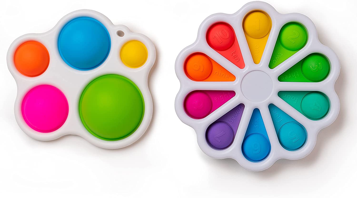 The package contains two simple dimple sensory toys – a flower fidget toy and a 5-bubble popper toy Both products are made from BRA-free silicone & plastic, safe for children 12+, and tested in CPSC-accepted lab Flower fidget toy has digits + numbers spelled in English in front and Spanish on the back Size: Flower Fidget Simple Digits Toy: 15*15cm, 5-bubble popper toy: 12.5cm*14cm