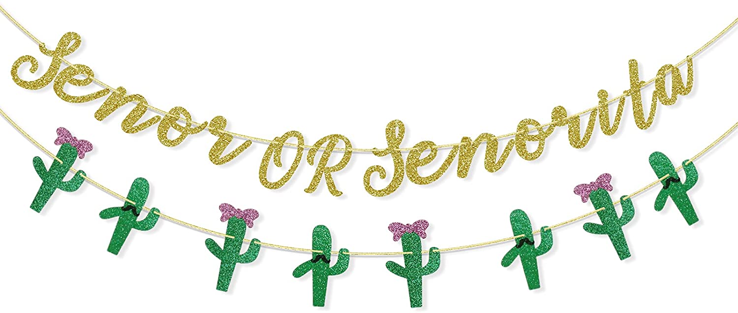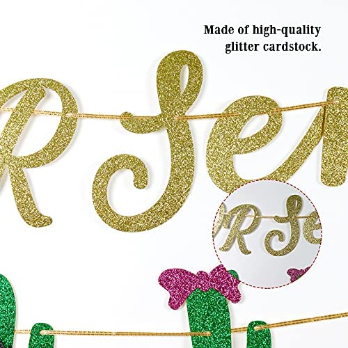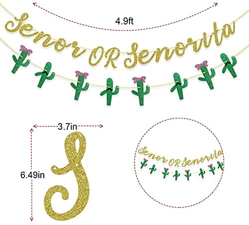 Size: The height of letter s is about 6.49 inches, width is about 3.7 inches. Total length of banner is about 4.9 ft. The banner is pre-assembled and the spacing between each letter is adjustable Premium material: Made of gold glitter cardstock. High-quality, sturdy and reusable Mexican style designs: Pink bow, blue hats in cactus patterns with the gold Senor or Senorita words to highlight the mexican theme party Occasion: It is perfect for dress up your birthday party dessert table, ceilings, backdrops and walls. Also you can hang it up from branches if have a nice weather Service: Our mission is to create a enjoyable shopping experience for our customers. We will deal with it quickly for you when you have any problem, for example, the item damage