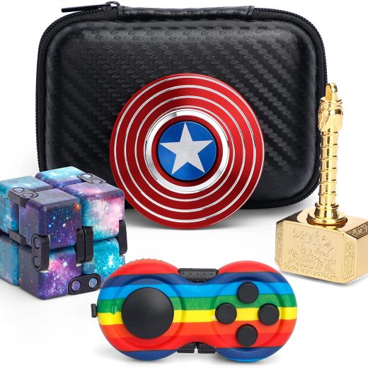 4PCS Fidget Toys Pack4 kinds of sensory figetget toys pack includes varieties of stress relief and anti-anxiety toys. 1* Shield Fidget Spinner, 1* Gold Hammer Fidget Spinner, 1* Galaxy Infinity Cube, 1* Fidget Controller Sensory Pad.1* Luxury carring case. Help stress relieve and improve deep thingking .