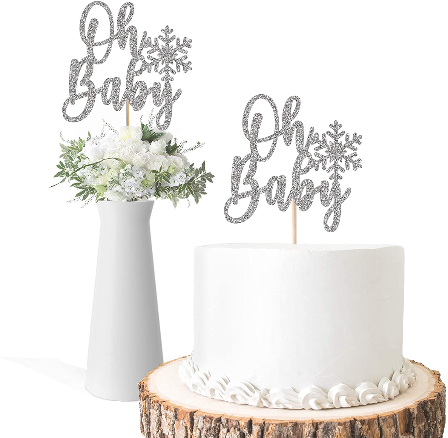(Set of 2) Snowflake Oh Baby Cake Topper or Centerpiece, Silver Glitter Winter Baby Shower Decorations, Wonderland or Gender Reveal Party Decor (Set of 2)