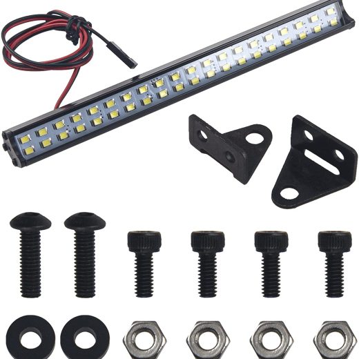 Fit for 1/10 RC Crawler Car,compatible with Traxxas Slash Rustler TRX4 Axial SCX10 Score Yeti Tamiya CC01 RCAWD D90 RedCat Gen8 1/10 Scale RC Crawler Car. The roof led light shell is made of aluminum alloy,better than the plastic one,druable to use. Come with L shape brackets ,adjustable for rotating light;Easy to install. Led Quantity:48Pieces,is more bright than other 36Led or 12led lights,makes your RC crawler more cool and attractive. Suggest Powered by the receiver or TRX ESC.If you need the JST Y Splitter cable ,you can find it from my store. If you do not have spare port for this led light,you may required the 6v battery pack(4Pcs 1.5V battery) as the power supply,need DIY for plug/connector. Great for running at night or in low light areas. Light Weight and Portable to Carry. Bright lighting with stable performance, it is practical and durable. Material: Aluminum Alloy LED Quantity: 48Pieces Working Voltage: 4.8V-7V;Can not connect to 2S battery,will be very hot Light Color : Bright White Cable Length:400mm Input Connector :Black JST Male Plug Mounting Hardware Type:L Shape Universal Brackets Color: Black Package Includes: 1 x RC Roof Light-48Led Lights 1 x Mounting Kit