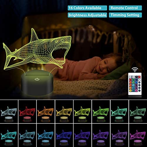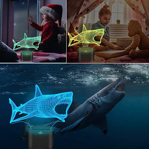 ?Creative 3D Visual Effect?3D visual creative lamp is an innovative artistic atmosphere light, optical acrylic light guide plate engraving a variety of 2D graphics, 3D visual impact. Unique lighting effects amazing optical visual illusion home decor lamp, It makes your room more interesting,Ideal as a bedside lamp and decor in a kid’s bedroom. ?Smart Touch and Remote Control?- You can touch the button on unicorn lamps base or use 16 colors remote control to change the colors and adjust brightness as you like. Two kinds of electricity supply: USB Power port (compatible with any usb power port) or 3*AA Batteries (Batteries not include) ?Perfect Gifts and Best Decor?- 3D Lamp is a new creative birthday gifts, Christmas gifts, Valentines gifts, unicorn lover, or holiday and festival gifts for kids baby girls boys friends or your lover. Ideal home bedroom decoration. ?Eco-friendly & Safety?The 3d shark lamp for kids is made from Safe approved eco-friendly material, safe and harmless to the human body. The night light comes with soft, uniform, non-flicker light, making it safe to your kids ? Protection & SAFE BUY?: We insists on 100% quality product before the 3d nightlight is given to you, the lights have been thoroughly tested. We offer 100% money-back protection: if it doesnt meet your need, CONTACT us, we will help
