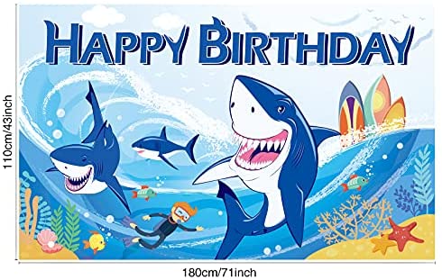 BABY SHARK BIRTHDAY DÉCOR: This blue shark birthday backdrop is perfect for seaside themed birthday party or beach birthday party decoration for kids, especially for boys . Also suitable for indoor décor, like bathroom decoration for child. It will make your birthday party more enjoyable and bring pleasant decoration for your house SIZE OF PARTY DÉCOR: This ocean themed birthday party shark party banner has a size of approximately 180 x 110 cm/ 70.87 x 43.3 inch (LH). Oversize font printed with playful shark design. It is big enough to show for all people in the party with vivid color and graphic design and bring extra happiness to the whole party PACKAGE KITS: The shark birthday party decoration set includes 1 piece of congratulations backdrop with a 6 meters rope. We design this rope long enough to tie and fit the size of different kinds of party DURABLE & REUSABLE: The shark party supplies is made of lightweight, strong and sturdy fabric, not fade easily. It can be hung with 4 grommet holes and string (package included) or put it up with tape. This background banner is reusable for future parties and can be used both indoors & outdoors PARTY DECORATION: The Shark element printing can be applied for family photo props during the themed party. You can take beautiful and memorable photos or selfies with this party background or birthday and anniversary event, which is a real good scenery for party decorations. It saves time and saves energy in decorating, can make your big party more enjoyable and lively