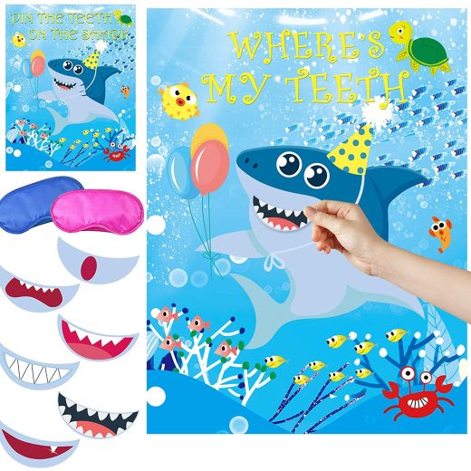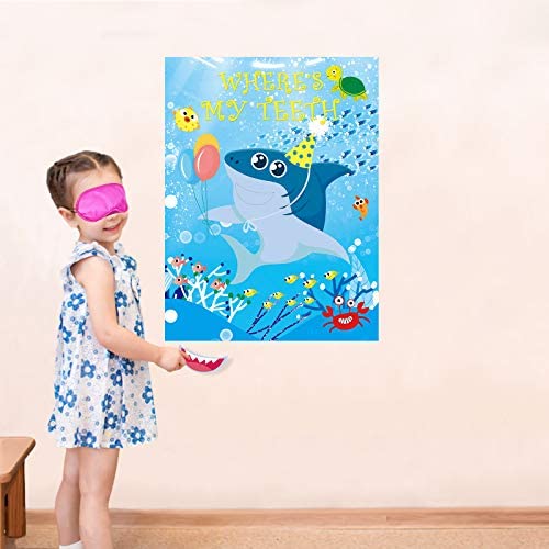 SO MUCH FUN FOR A SHARK PARTY ! Help the little shark to find her or his teeth for pinning the shark teeth sticker. It will be a big hit for your s…