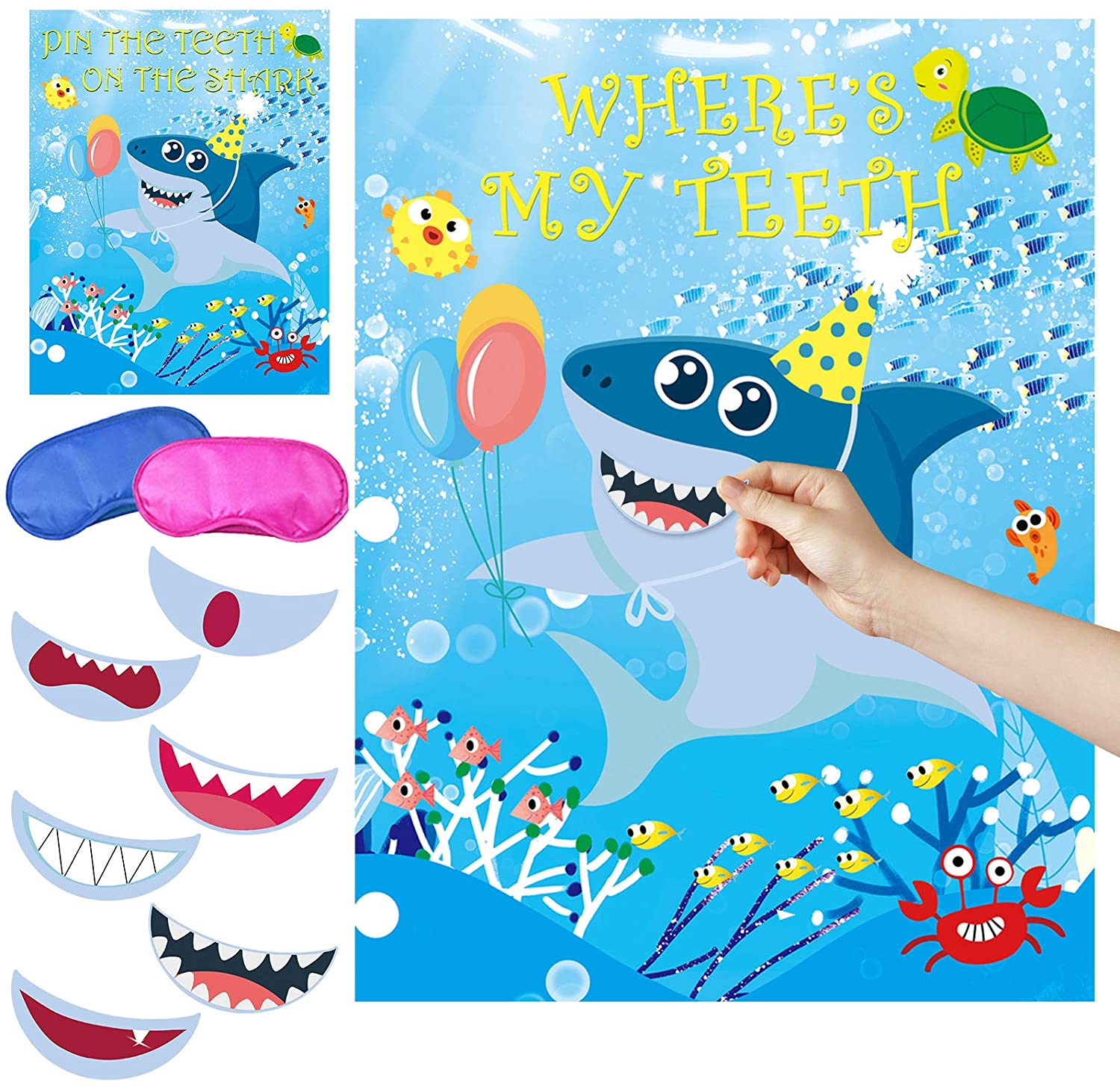 SO MUCH FUN FOR A SHARK PARTY ! Help the little shark to find her or his teeth for pinning the shark teeth sticker. It will be a big hit for your shark theme party, ocean party and classroom party. PACKAGE OF SHARK PARTY FAVORS A. 1 shark poster B. 36 teeth or mouth stickers C. 2 eye mask HOW TO PLAY A. keep the poster steady — Keep the shark poster close to the wall, door or other place with tape and make it steady. B. Play –Wear the eye mask and keep the shark teeth sticker close to the spot on the poster. C. Winner—the person who’s sticker is nearest
