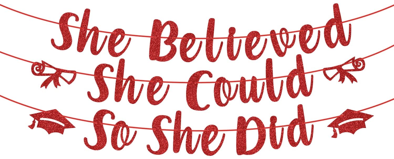 She Believed She Could So She Did Banner – Congrats Grad Party Decoration for Class of 2022, 2022 Graduation Decorations (Red)