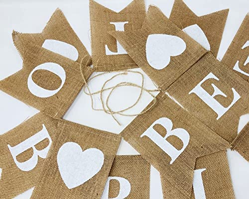 Reusable 1 Piece Burlap Banner. Size: 5 inches x 7 inches (W x H). Color: White print on rustic burlap. String Length: 9 feet. Material: 100% reusable burlap. Pre-assembled: Distance adjustable. Easy to hang, fold and store.